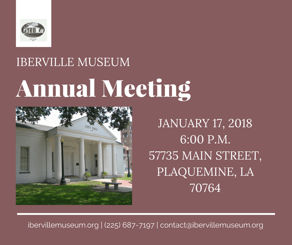 Iberville Museum’s Annual Meeting will be held Wednesday, January 17, 2018 at 6:00 P.M. at the museum. Our keynote speaker this year is Cliff “Chachie” LeGrange, industrial engineer and author of Bayou Pigeon, Louisiana: Spirit of the Atchafalaya.