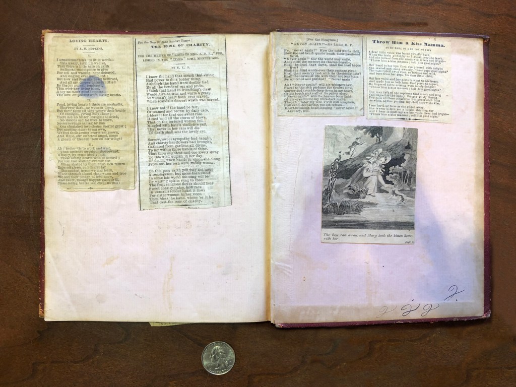 Marie Pamelia Marchland was the granddaughter of Evariste Lauve and Celeste Brunet, who established Celeste Plantation in Bayou Goula. Her album contains well wishes, signed during Christmases at Tally Ho and Celeste Plantations in 1860-1862, as well as lithographs of girls, poems about the war, and newspaper clippings on Southern ladies and womanhood. Therefore, her book had a dual use as a scrapbook and an autograph book.