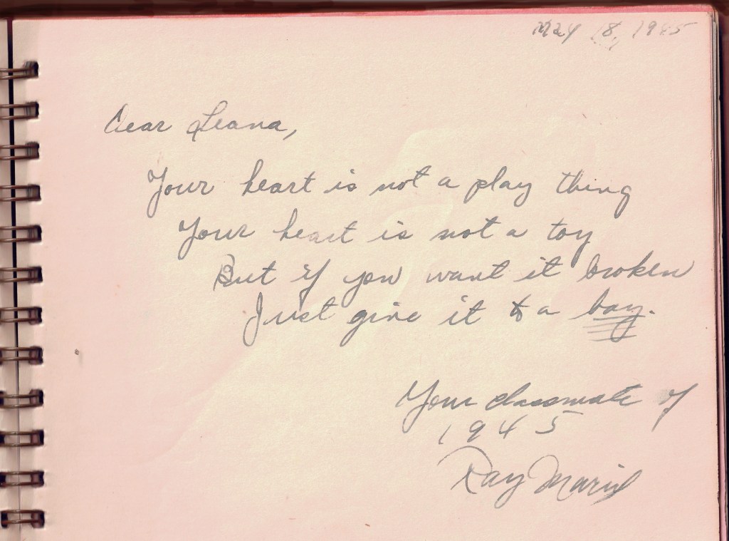 As seen in the autograph books owned by Verna Mae Kirkland and Leana Boudreaux Brady, both women went to Plaquemine High School during the 1940s. During their last months there, they passed their books’ around.